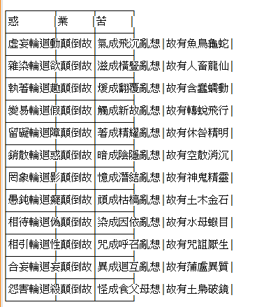 ‘阿难!如是地狱、饿鬼、畜生、人及神仙、天洎修罗,精研七趣,皆是昏沈诸有为相。妄想受生,妄想随业,于妙圆明无作本心,皆如空华,元无所著。但一虚妄,更无根绪。阿难!此等众生不识本心,受此轮回,经无量劫不得真净。皆由随顺杀、盗、淫故;反此三种,又则出生无杀、盗、淫。有名鬼伦,无名天趣,有无相倾,起轮回性。若得妙发三摩提者,则妙常寂。有、无二无,无二亦灭,尚无不杀、不偷、不淫,云何更随杀、盗、淫事?阿难!不断三业,各各有私,因各各私,众私同分非无定处。自妄发生,生妄无因,无可寻究。汝勖修行,欲得菩提,要除三惑。不尽三惑,纵得神通,皆是世间有为功用,习气不灭,落于魔道。虽欲除妄,倍加虚伪,如来说为可哀怜者。汝妄自造,非菩提咎。作是说者,名为正说;若他说者,即魔王说’。