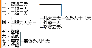 ‘阿难!世间一切所修心人,不假禅那,无有智慧。但能执身不行淫欲,若行、若坐想念俱无,爱染不生无留欲界;是人应念身为梵侣,如是一类名梵众天。欲习既除,离欲心现,于诸律仪爱乐随顺,是人应时能行梵德,如是一类名梵辅天。身心妙圆,威仪不缺,清净禁戒加以明悟,是人应时能统梵众为大梵王,如是一类名大梵天。阿难!此三胜流,一切苦恼所不能逼。虽非正修真三摩地,清净心中诸漏不动,名为初禅。阿难!其次梵天,统摄梵人圆满梵行,澄心不动寂湛生光,如是一类名少光天。光光相然,照耀无尽,映十方界遍成琉璃,如是一类名无量光天。吸持圆光,成就教体,发化清净,应用无尽,如是一类名光音天。阿难!此三胜流,一切忧悬所不能逼。虽非正修真三摩地,清净心中粗漏已伏,名为二禅。阿难!如是天人,圆光成音,披音露妙,发成精行,通寂灭乐,如是一类名少净天。净空现前,引发无际,身心轻安,成寂灭乐,如是一类名无量净天。世界身心一切圆净,净德成就,胜托现前,归寂灭乐,如是一类名遍净天。阿难!此三胜流,具大随顺,身心安隐得无量乐。虽非正得真三摩地,安隐心中欢喜毕具,名为三禅。阿难!复次、天人不逼身心,苦因已尽;乐非常住,久必坏生,苦乐二心俱时顿舍。粗重相灭,净福性生,如是一类名福生天。舍心圆融,胜解清净,福无遮中得妙随顺,穷未来际,如是一类名福爱天。阿难!从是天中有二岐路:若于先心,无量净光福德圆明修证而住,如是一类名广果天。若于先心,双厌苦乐,精研舍心相续不断,圆穷舍道身心俱灭,心虑灰凝经五百劫;是人既以生灭为因,不能发明不生灭性,初半劫灭,后半劫生,如是一类名无想天。阿难!此四胜流,一切世间诸苦乐境所不能动。虽非无为真不动地,有所得心功用纯熟,名为四禅。阿难!此中复有五不还天。于下界中九品习气,俱时灭尽,苦乐双亡;下无卜居,故于舍心众同分中,安立居处。阿难!苦乐两灭,斗心不交,如是一类名无烦天。机括独行,研交无地,如是一类名无热天。十方世界妙见圆澄,更无尘象一切沈垢,如是一类名善见天。精见现前,陶铸无碍,如是一类名善现天。究竟群几,穷色性性入无边际,如是一类名色究竟天,阿难!此不还天,彼诸四禅四位天王独有钦闻,不能知见。如今世间旷野深山圣道场地,皆阿罗汉所住持故,世间粗人所不能见。阿难!是十八天独行无交,未尽形累。自此已还名为色界。复次、阿难!从是有顶色边际中,其间复有二种岐路:若于舍心发明智慧,慧光圆通便出尘界,成阿罗汉,入菩萨乘,如是一类,名为回心大阿罗汉。若在舍心舍厌成就,觉身为碍,销碍入空,如是一类名为空处。诸碍既销,无碍无灭,其中唯留阿赖耶识,全于末那半分微细,如是一类名为识处。空色既亡,识心都灭,十方寂然迥无攸往,如是一类名无所有处。识性不动,以灭穷研,于无尽中发宣尽性,如存不存,若尽非尽,如是一类名为非想非非想处。此等穷空,不尽空理。从不还天圣道穷者,如是一类名不回心钝阿罗汉。若从无想诸外道天穷空不归,迷漏无闻,便入轮转。阿难!是诸天上各各天人,则是凡夫业果酬答,答尽入轮。彼之天王,即是菩萨游三摩提,渐次增进,回向圣伦所修行路。阿难!是四空天身心灭尽,定性现前,无业果色,从此逮终,名无色界。此皆不了妙觉明心,积妄发生,妄有三界,中间妄随七趣沉溺。补特伽罗,各从其类。