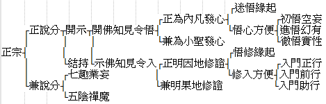 正说分、兼说分,分齐易明。摄论‘顿问顿答’一章,并在‘迷悟缘起’科内。‘重请重告’一章,并在‘五阴禅魔’科内。结名奉持之后,始说七趣、五阴,别有缘起,在本经但兼说而已。结名之前,正为从迷得悟、从悟修入而说。正说周圆,故结名奉持也。此为一经大分,应如是判。开示、结持,分齐易明。‘开示’,即摄论‘转三道成三德’之一科。由今观之,但作‘开’之与‘示’二科为当:开众生心本有之佛知见令自发悟,示因果地证成之佛知见令依修入,此正说中大分如是。不应将修圆通、证菩提,并列为二也。前三卷、为内凡开发心地,是此经开悟科中正中之正。第四卷至方悟神珠不从外得,是此经开悟科中正中之兼,因一经总缘起所关在阿难故。内凡科中‘迷悟缘起’,当从唯有阿难先受别请起,至阿难顶礼伏受慈旨止,为一经密显之总缘起故。‘悟心方便’科中,‘初悟遍计妄空’,即初拂落客尘虚妄相想,悟心性空寂也。进悟依他幻有,即恍然于见性之无是物者、无非物者而如幻如梦,无定相实法之可执取也。所谓魂虑变慑失其所守是也。大悟圆成实性,从二卷非自然非因缘起,至三卷尽可知,兼为小圣发心,大致令舍遍计所执染依他法,即证得圆成实性净依他心而已。明此可知皆唯识宗之义。示佛知见令入,则观世音等之二十五圣,所证圆通,是示伏还元真、得圆明觉为因地心之佛知见。顶光化佛神咒功德,清净修证真菩提路,是示圆成果地修证之佛知见;要皆令已悟本有佛知见者修进证入也。然以因地修证,为此示入科中正中之正,亦因一经总缘起所关故。因地科中‘悟修缘起’,当从第四卷中即时阿难在大众中顶礼佛足起立白佛,至应当先明发觉初心二决定义止。阿难已发心出淫爱家而重堕淫爱家,是此经第一发起之缘,前之迷悟缘起是也。阿难已悟心出戏论圈而重堕戏论圈,是此经第二发起之缘,今之悟修缘起是也。堕淫爱是事障,堕戏论是理障。事障非悟不破,理障非修不除;破事障、救之以密言而唯令悟本心,除理障、救之以显呵(此显呵中重复回顾前堕淫室事缘,以理障为事障之本,理障不除则事障虽破,犹得他起也)而兼教持顶咒;故同为本经显密之总缘起也。此令应当先明发觉初心二决定义,犹初卷中许说‘大佛顶首楞严王’也。然彼总括开示悟入,此则局是从悟修入得元明觉为因地心而已。至闻文殊选定圆通获益之文,为入门之正行;说毗捺耶四种决定清净明诲,为入门之前行;结坛持咒为入门之助行。入门者,入佛知见华屋门,即得元明觉为因地心也。除理障之正意,祗重于此。重请重说神咒,是示密严果海之佛知见。从于凡夫终大涅槃,悬示无上正修行路,是入密严果海之佛知见,即圆成果地修证也。然三渐次,仍即‘入门正、前、助、之三行’。依第二重金刚干慧,所起十信、十住、十行、十向、四加、十地、等觉之五十位真菩提路,为圆成果地修证。然其意仍重在三渐次中第一重、所历之单复十二,故以果地修证为兼明耳。因地修证,是悟入唯识资粮、加行、通达位,是第一重单复十二。金刚干慧以后第二重之单复十二,是悟入唯识修习位之所开出,乃密宗金刚界之修位也。一念中所悟得之义,未能尽言。姑出此纲要,以供海众研究耳。
