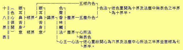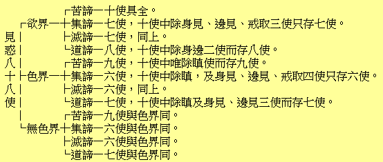 他的意思是说:欲界的苦谛下,是十种烦恼(十使)都具全的(苦下具一切)。集谛和灭谛,要除去“身见”“边见”和“戒禁取”这三使,只有七使(集灭各除三)。至于道谛只除“身见”和“边见”两使,还有八使(道谛除二见)。以苦谛具十使,集灭各七使,道谛八使,成为三十二使。本来上两界也各有三十二使(色界三十二、无色界三十二),但因为它(上两界)是没有瞋心的,所以,四谛下各要除去四个瞋——四使,因此,每界只有二十八使,二界共五十六使,连前欲界三十二成为八十八使。列表于下: