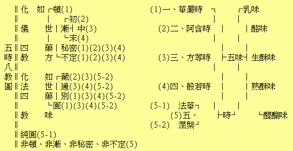 复次,涅槃经圣行品中有以一牛出五味次第成熟的譬喻(注五),谓:最初由牛出乳,次由乳出酪,由酪出生酥,由生酥出熟酥,由熟酥成醍醐味。此五味的成熟次第正如释尊以五时成熟众生根性一样。一华严时,为佛初成道时对一类大机直谈大乘圆顿法门,譬如从牛出乳,故华严时为乳味。二阿含时,佛隐大现小,说华严后次说阿含经,如从乳出酪,故阿含时为酪味。三方等时,为引小向大,说阿含后次说方等诸大乘经,如从酪出生酥,故方等时为生酥味。四般若时,为除执,废情,故说方等后次说般若,如从生酥出熟酥,故般若时为熟酥味。五法华时,为开权显实,故说般若后即说法华,如从熟酥成醍醐,故法华时为醍醐味。以上略说五时五味的内容。