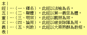 然而要根据那一宗来讲呢?我虽禅参临济,教却学习天台,现在就把天台的五重玄义来谈谈吧!(五重玄义见本经附录,因恐初学厌繁,故别刊经末。)