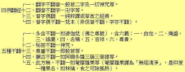 基于上面所说的几点理由,故不译,以表尊重。兹把四例翻经,及五种不翻列表如下: