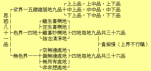 其次思惑共八十一品,它是以贪瞋痴慢四使合为一品,历三界九地——色界的四禅天四地,无色界的四空天四地,欲界的五趣杂居地(六趣除修罗一趣,因为修罗通于五趣故)为一地,共成九地,每地九品,九九成八十一品。列表如下: