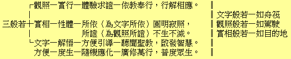 总之:从听闻言教,或自己阅读经典所开发的智慧,叫做文字般若;又名闻慧。依所解悟的道理实际地去体验修习,叫做观照般若;又名思慧。由观照工夫的深造,一旦豁破无明,亲见本来面目,叫做实相般若;亦名修慧(因由修而证得故)。又自性虚灵不昧,谓之实相般若;依理进修,所行与所解相应,谓之观照般若;由圣教启发的清净智,谓之文字般若,此乃约通途而说。若单就本经所明者,则指解悟诸法皆空之理,谓之文字般若;依法空无我慧,去观察觉照,谓之观照般若;彻悟法性无相,亲证实相,谓之实相般若(实相般若理也,观照般若行也,文字般若教也)。