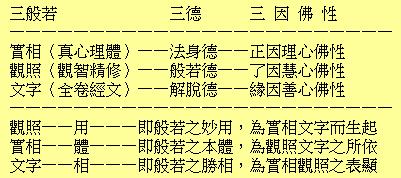 兹约三德及三因佛性会通之:实相般若,在三德谓之法身德,在三佛性谓之正因理心佛性;观照般若,在三德谓之般若德,在三佛性谓之了因慧心佛性;文字般若,在三德谓之解脱德,在三佛性谓之缘因善心佛性。