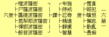 要知道“波罗密多”的上面加般若二字者,正显示安乐的彼岸是要依仗般若才能到达的;尤其要做到一切事的究竟——亲证实相,当以般若为成功的工具;复因波罗密有六种,今标般若二字正拣别不是其他——布施……等之波罗密。六种波罗密,就是六度。谓依此六法能度生死苦海,到达涅槃彼岸,故以六度称之。又六度能度“六蔽”。蔽是遮蔽的意思,因此六种能遮蔽各人真心本性,使之不得显现,故以六蔽名之。兹将六度、六蔽列表如下:
