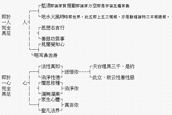 辛一、略以情想明(至众同分中兼有元地是):实本真净,即见犹离见、见不能及者。妄见、即是同分、别业二种妄见。且据众同分判内外分,外颣众同分、即种种情器世间,即就此员舆上人世间论(断自历史所纪,轮蹄所及,所谓六合内者)。人世间为分内,胜出人世间上者为分外(外分是想慕境,地狱虽分外但由情缠而坠,非存想慕,故外分必是胜出其上者。外教求生天等,正此所谓渴想分外也)。心性如空,本无形段,绝生佛之假名,故曰实本真净。人心情想惟均,俗谓得天地之中和者也。爱着内分(亦可恃已所能、所知、所有者为内分),则谓之情(世典亦名人欲、欲情,凡贪权利快身意而起者,恩仇恋恨皆是,亦若今边沁派等伦理学):一味凝合,如空起云,集云致雨,积雨成水,水必下流,故坠地狱。渴慕外分(亦可增进己所未能、未知、未有者为外分),则谓之想(世典亦名天理、理想,凡修名誉立道德而起者,仁诚礼智皆是,亦若今康德派等伦理学):一味开化,如冰融水,蒸水为雾,雾散成气,气必上腾,故升天界。若兼福慧净愿,心开见佛(此同第二渐次成相),则几乎复人心之本空,性水真空,性空真水,遍周法界矣。除此地狱、人、天三类,余有情趣,亦情多想少,想多情少,互为腾坠耳。然则皆由妄见,积生妄习;妄习既成,妄报定有,三界惟是心造明矣。虽是自心造业招报,众同分中(此且指定娑婆世界为众同分)兼有元地。此若人间监狱,非自然有(若禽兽类不以人之监狱起监狱想,此人之妄见、妄习、妄报不同分也),非无所在(由人群共业造成此监狱,同认此为监狱,此即人之同分妄习、同分妄见),非一切人皆被拘禁。以犯人群业习见中所同认之罪恶,方入监狱(此即彼彼发业、各各私受者也)。虽一切人非同受苦,狱中罪人固同受苦(此譬地狱众生之同分妄见、同分妄报也)。设人间永无犯罪人,则监狱之名不得存,而监狱可为房舍。盗贼处处恐人询察拘禁,虽行空旷亦同监狱。悟此则七趣本空,而业果不失,明矣。生从顺习,生是人所欲也,死从变流。人既生必死也。顺趣相交,善恶俱现,从俱现中随业引生,故纯善即升,纯恶即沉也。