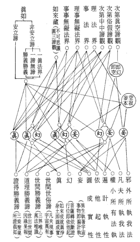 己二、约四谛显如来藏而劝妙修(从四卷初起、至显如来藏章尽是也):集谛、苦谛,六凡之因果也。亦九法界之因果也。道谛、灭谛,四圣之因果也,亦佛法界之因果也。故四谛者,即十界、百界三千性相也。由如来藏随缘不变,故有理具三千;由如来藏不变随缘,故成事造三千。迷悟顺逆,染净真妄,胥莫越乎兹矣,所谓道理胜义谛也。而开显之如来藏,则与前无二,皆圆空、圆不空、圆空不空者也。特所就之门有异也。故裂为三藏者,非也。然初心悟入亦随门浅深,即如天台所立通教,正为菩萨,本是圆教具德圆融之第一义空门。然同由此门入道者,或仅见生空而退同藏教,或见生空真如而成通教大阿罗汉,或虽见二空真如而真如不融诸法。若单闻教者,则决不退通、退藏也。是故若从前章但见融泯万法唯如来藏,性真常中了无一法可得,则颇同曹溪从无住生心悟入,而曰‘本来无一物’者,黄梅谓之亦未见性。逮后重闻说金刚经,乃悟自性本来具足功德。则此章明事造十法界,亦如来藏中性具者,又乌可少哉!故谓祇释余疑者,亦非也。又前章蕴、处、界、大(相想空大、见精根大),皆十法界共依者。一向离十法界假相,非圣非凡,无修无证。此章竖显佛界性、相、果、报,乃至狱界性、相、果、报,迷悟、染净历然不同;则逆顺修相明而得进劝乎妙修矣。尝观法华五品,前之三品名曰随喜、读诵、讲说,阿难随喜闻听善说法要之富楼那与佛问答,亦正审除细惑,而为观行即佛之向相者。从此章悟入者,了无一法可得,亦不异前。特法法皆通、法法皆备耳。此又分二: