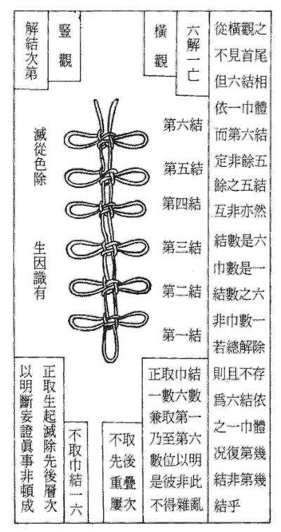 由一巾绾六结,解六结时即有此之四喻:一、取巾上六结数位,第二结位非第六结。喻六根虽由一心成,一心体既妄织成六结根,见不超色,听不出声,眼根非余五根,乃至意根非余五根,故毕竟同成毕竟异。此是立法喻之依者,正明在六解一亡也。二、取巾之一数、结之六数对勘,结之数位若存,不独六结各住自之数位,彼此相非;亦复结住于六数位,非彼巾住于一数位(巾一数位非前第一第六数位,彼六结数从次第生,故曰第一乃至第六,此一巾数非次第生,故但六结对巾名一,非彼六结第一之一)。若将巾上六结一切解除,尚无结之六数位对巾名巾一数,况有六结各自住位数,而第一数非第余数乎?喻对用中相背,六根毕竟六异。故名性中相知,心体毕竟一同。令悟六根织妄生起,知是妄结可解除耳。若六根既解除,则无复各各相异之六数;更对谁而名心体为一乎?此释颂中六解一亦亡者。盖心真如体,如实非一非异,一异自在也。若定一者,应不具足无量功德;亦应不能寄根明发,六根互用。若定异者,六和合根应非是结,不可离碍而成互用;且体相用应不圆融。故灭异而守一,是小乘所取涅槃耳。若复不从三无漏道修证,则无想天诸舜若多、及无色界诸空定天而已。故六位除,而先明一亦不立也。然此中正取六结喻六根,兼□取第一乃至第六数位上,不能彼此杂乱之义。以喻异生业系受身,眼根在处,非余五根在处;乃至意根亦然。眼根功用,不能作余五根功用;乃至意根亦然。而无取乎次第绾生,次第解除,前后重叠义也。然本经自审观烦恼根本,以旋销六根,喻解六结者,已非一词;而六解一亡,又正从唯汝六根言来。确是对解六根妄则亡一心真说者,则六结非喻六根而何哉!若非以六结数不可杂乱,喻六妄根六毕竟异,而结不定须六数者;复何为结不成七,亦不停五乎?故谓巾结非横喻六根、及不拘定六数者,非也。三、取结之左右交绾相,喻尘所发识,根所取尘。而以结心(心训当中)喻根、为识、尘媒,而居识、尘之间。明根、尘、识生死妄结,当从根以解也。此则不取六数,而兼为解结次第立依者。四、取巾上之结,次第绾生,是故解结亦须次第。兼□取第一乃至第若干之数位上,不能先后杂乱之义。喻六根中随一深入,旋灭妄业,渐证真性之增进次位,不能躐等也。此释颂中解结因次第者。而无取乎六数、与第一结第六结,及巾一结六、彼此是非义也。故谓六根非一解全解,须别别次第而解;及谓六结是竖喻一根中定有六重、所当渐次而解除之妄结。由是强配之为动结、静结等,亦非也。案此章中,佛言六根解除(是总举六根随一深入而渐次一解全解,非谓先解一根而渐次再解一根,一根至六根尽也),亦复如是。此根初解,先得人空,空性圆明,成法解脱;解脱法已,俱空不生。则但三重层次,而无六数。且得人空,根结已解,不应仍名为结;而法解脱正是一亦亡耳。又案十卷,明五妄想成五阴元,重叠生起,因界浅深,生因识有,灭从色除。亦但五重层次而无六数。且识边际湛入合湛,亦复非有六异结相。故知解结次第喻中,定不取六数,及以渐进一重为解一结也。说本经者,于此多不明了。盖由未悟能喻之物虽一,取以为喻之事及所喻法,可不同耳。比若有一愚夫,喻之其蠢如牛;同时有一勇士,喻之其力如牛。能喻之牛虽一,取以为喻之事,一则在蠢,一则在力;所喻之人,一是愚夫,一是勇士。不应以能喻物同一牛故,责愚夫有勇士之力,执勇士同愚夫之蠢。明此,则可无疑乎此章一结巾而异喻矣。为佛绾为巾结,非第一绾成时立第一结标记,乃至第六绾时立第六结标记。纵立标记,去除标记,则失第一第六、彼此先后之异。结成不灭,何以结未总除,而彼此先后不能杂乱乎?若不发明此意,则六解一亡中,六结虽存,第一结可名第余结。不应第六终非第一。则异生六根虽未解,亦应眼根能听或尝,而不成横中彼此之异矣。在解结中亦可生从色有,灭从识除,而不成竖中前后之异矣。欲明斯义,今再图以明之: