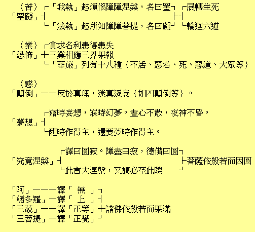 以无所得故,菩提萨埵,依般若波罗蜜多故,心无挂碍,无挂碍故,无有恐怖,远离颠倒梦想,究竟涅槃。三世诸佛,依般若波罗蜜多故,得阿耨多罗三藐三菩提。