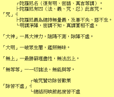 (按)经语有五种不翻,唐代玄奘法师所立,咒语即其一也。秘者深奥难言之义,密为隐密不易示人。又显法诵持,往往寻文思义,不得专一;秘法诵持,不起分别,易成三昧。闻密宗大德云:咒文不尽梵语,通乎各趣,即天竺人,亦每有所不解。但求信心薰习,净心感应,故文例不许翻,语例不强解,谨遵之。然各经多有显说密说,不独本经。显说者义详,密说者义简,详简皆说一事;知其显,可会其秘密矣。