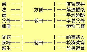 随缘济众,其类至繁,约言其纲,大约有十:第一与人为善,第二爱敬存心,第三成人之美,第四劝人为善,第五救人危急,第六兴建大利,第七舍财作福,第八护持正法,第九敬重尊长,第十劝人爱惜物命。