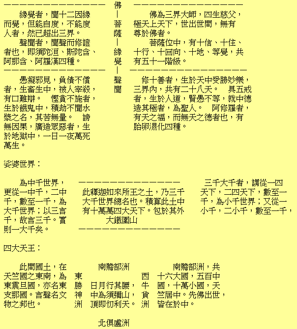 自大地水轮之下,至他化自在天,皆名欲界,以其犹有情欲也。自下至上,共有六天。一四王天(四大天王,分领四大部洲,去地四万二千由旬,宫殿齐于日月)。二忉利天(梵语忉利,此言三十三,中间为帝释所居,八方各有四大臣辅之,合成其数,故名。非自下至上之三十三也。去地八万四千由旬)。三夜摩天(此天以上,为仙家所不知,故道书无此名色)。四兜率天。五化乐天。六他化自在天。六天每过一劫,皆有火灾坏之。其间寿命长短及宫殿城邑、身衣轻重等,详载《藏经》,兹不繁举。