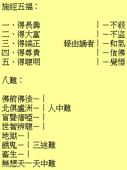 〔发明〕难有多端,约言之,不出七种:一水、二火、三官非、四盗贼、五刀兵、六饥馑、七疾疫也。在水火者,以拯拔为救;在官非者,以昭雪为救;在盗贼刀兵者,以脱离为救;在饥馑者,以财帛为救;在疾疫者,以医药为救。救均发于至诚。见人之难,如己之难,尽其智谋,竭其财力,使救之之念,十分圆满而后已。难至而救,救之有形者也,孔子所谓“听讼吾犹人”也。复有一法,使人自然无难,其功更有倍焉,则孔子所谓“使民无讼”矣。何则?人之患难,皆前业所致,今世不种苦因,来生自无苦果。若能劝人不造杀盗淫妄之业,则救人之难亦多矣。是故救难于已然,所救有限;救难于未然,其救无穷。救难于已然,凡夫之善行;救难于未然,菩萨之修持,二者并行不悖。 下附征事(二则)
