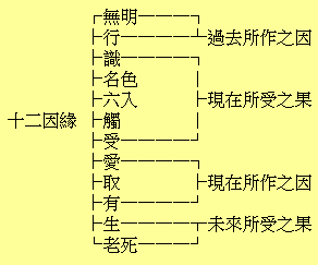 此十二因缘,乃说人生之生死苦果之起源及次序。藉流转还灭二门以显示世间及出世间法。流转者,无明乃至老死之世间法。还灭者,无明尽乃至老死尽之出世间法。