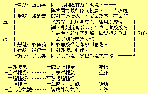 五蕴,即旧译之五阴也。世间万法无尽。欲研高深哲理及正当人生观。应先于万法有整个之认识,有统一之概念。佛法既含有高深之哲理及正当人生观,应知亦尔。