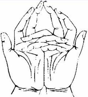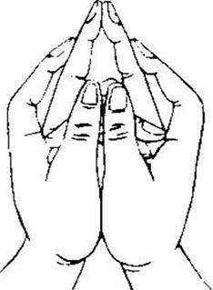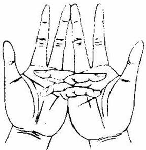 总摄二十五部大曼茶罗尼印:以二手无名指、小指相叉于内,二中指直竖相拉,二头指屈附二中指第一节,二母指捻左右手无名指中节。若有召请,二头指来去。
